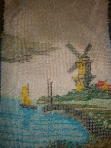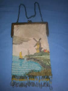 El molino de Wijk bordado en un bolso es en realidad un bolso con bastidor metálico y flecos. El interior va forrado en seda con un bolsillo.